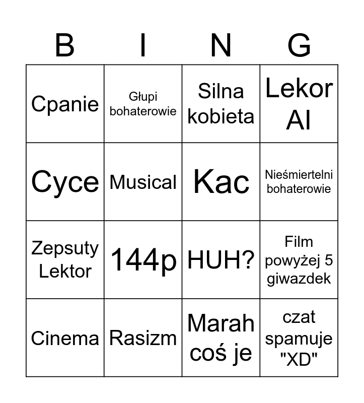 This bingo card has 20 words: Film powyżej 5 giwazdek, film poniżej 5 gwiazdek, Silna kobieta, Mammon Reference, Cinema, Cyce, Rasizm, Cpanie, Zepsuty Lektor, Głupi bohaterowie, 144p, HUH?, Musical, czat spamuje "XD", Kac, "Film o 1:00", Nieśmiertelni bohaterowie, Lekor AI, Marah coś je and Dobra muza.