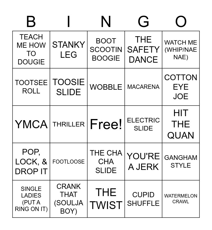 This bingo card has a free space and 26 words: THE CHA CHA SLIDE, CUPID SHUFFLE, WOBBLE, CRANK THAT (SOULJA BOY), WATCH ME (WHIP/NAE NAE), TEACH ME HOW TO DOUGIE, TOOTSEE ROLL, STANKY LEG, HIT THE QUAN, YOU'RE A JERK, MACARENA, YMCA, GANGHAM STYLE, SINGLE LADIES (PUT A RING ON IT), THRILLER, 1, 2 STEP, THE SAFETY DANCE, POP, LOCK, & DROP IT, BOOT SCOOTIN BOOGIE, WATERMELON CRAWL, COTTON EYE JOE, THE TWIST, ELECTRIC SLIDE, FOOTLOOSE, TOOSIE SLIDE and THE HUMPTY DANCE.