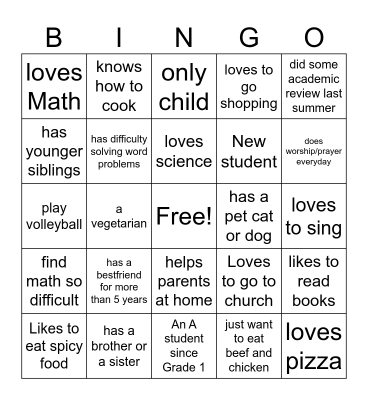 This bingo card has a free space and 29 words: Can play a musical instrument, has a brother or a sister, only child, has traveled to different country, did some academic review last summer, loves Math, has difficulty solving word problems, loves science, has a pet cat or dog, likes to read books, Likes to eat spicy food, a vegetarian, just want to eat beef and chicken, loves pizza, play volleyball, can speak different language, An A student since Grade 1, Loves to go to church, does worship/prayer everyday, find math so difficult, has a bestfriend for more than 5 years, been in GAA since K, New student, loves to sing, has younger siblings, knows how to cook, helps parents at home, loves to go shopping and never played any video games.