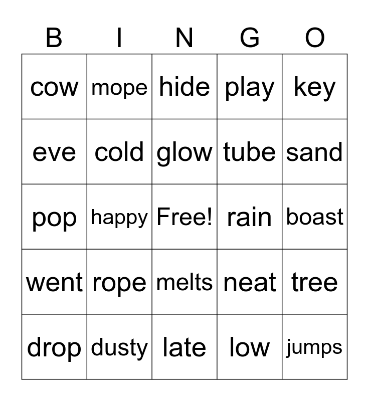 This bingo card has a free space and 24 words: drop, rope, glow, low, key, cow, mope, hide, rain, boast, pop, cold, neat, tree, eve, dusty, late, play, sand, went, happy, melts, tube and jumps.