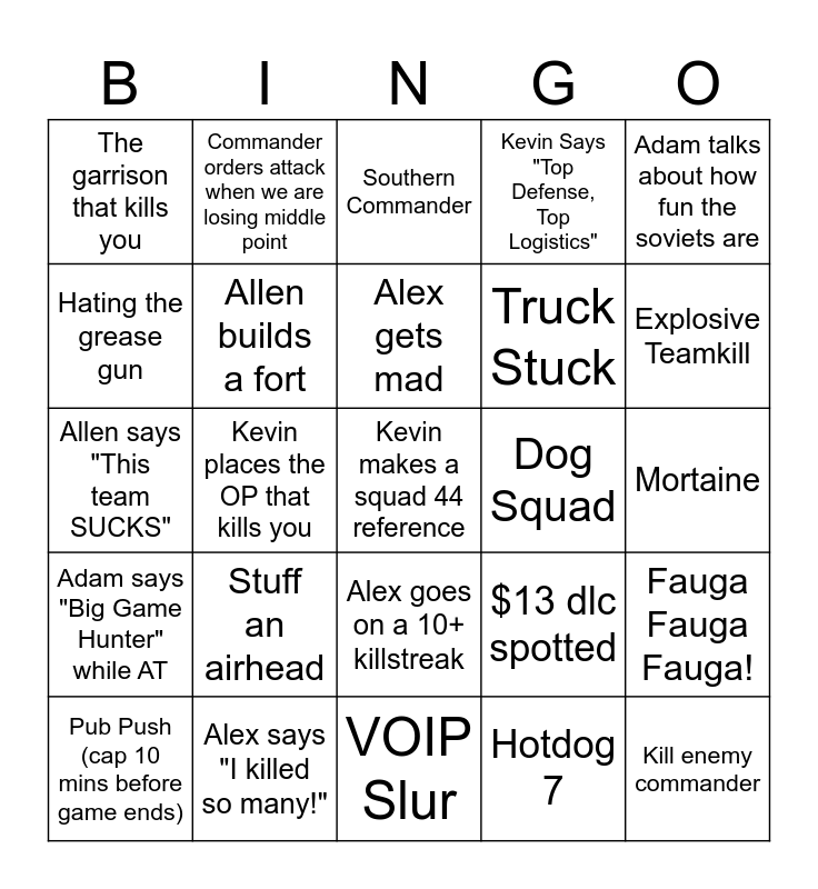 This bingo card has 40 words: Free!, Allen says "This team SUCKS", Allen goes commander after no one else will, Allen builds a fort, Alex says "I killed so many!", Alex goes on a 10+ killstreak, Alex gets mad, Adam goes AWOL to destroy nodes, Adam talks about how fun the soviets are, Adam says "Big Game Hunter" while AT, Kevin places the OP that kills you, Kevin Says "Top Defense, Top Logistics", Kevin makes a squad 44 reference, Mortaine, Dog Squad, Stuff an airhead, The airhead that kills you, The garrison that kills you, Headshot by artillery, Southern Commander, Fauga Fauga Fauga!, Hotdog 7, Truck Stuck, Hating the grease gun, Recognize someone from another game/sever, Luchs :), Getting the tank type wrong, Destroy a tank with an AT gun, Kill enemy commander, Recon squad nemesis, Get back capped immediately after losing point, Pub Push (cap 10 mins before game ends), German smoke and frag mix-up, $13 dlc spotted, Explosive Teamkill, VOIP Slur, Mine Kill, Someone gets too intoxicated, Commander orders attack when we are losing middle point and Flamethrower rando.