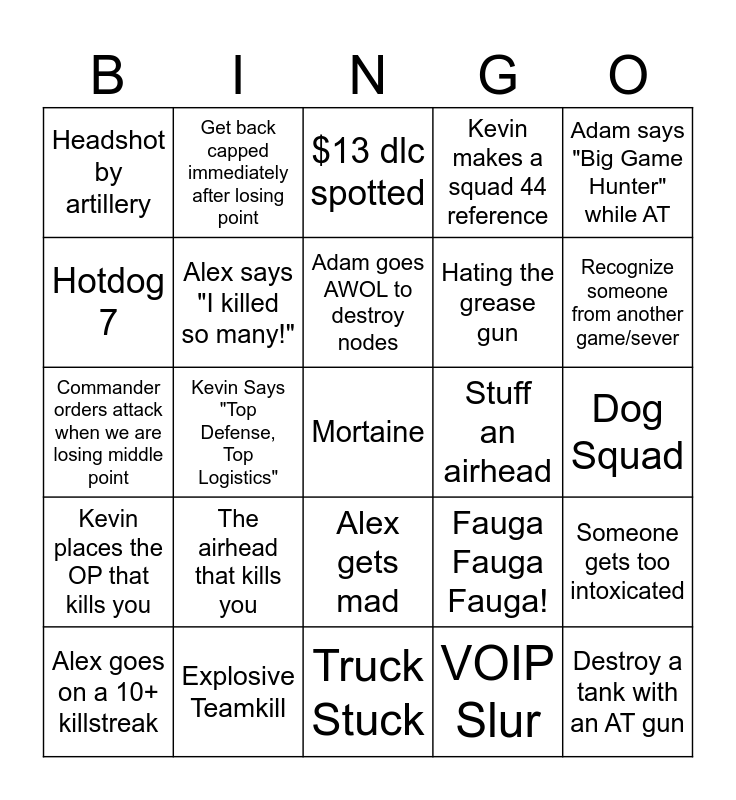 This bingo card has 39 words: Allen says "This team SUCKS", Allen goes commander after no one else will, Allen builds a fort, Alex says "I killed so many!", Alex goes on a 10+ killstreak, Alex gets mad, Adam goes AWOL to destroy nodes, Adam talks about how fun the soviets are, Adam says "Big Game Hunter" while AT, Kevin places the OP that kills you, Kevin Says "Top Defense, Top Logistics", Kevin makes a squad 44 reference, Mortaine, Dog Squad, Stuff an airhead, The airhead that kills you, The garrison that kills you, Headshot by artillery, Southern Commander, Fauga Fauga Fauga!, Hotdog 7, Truck Stuck, Hating the grease gun, Recognize someone from another game/sever, Luchs :), Getting the tank type wrong, Destroy a tank with an AT gun, Kill enemy commander, Recon squad nemesis, Get back capped immediately after losing point, Pub Push (cap 10 mins before game ends), German smoke and frag mix-up, $13 dlc spotted, Explosive Teamkill, VOIP Slur, Mine Kill, Someone gets too intoxicated, Commander orders attack when we are losing middle point and Flamethrower rando.