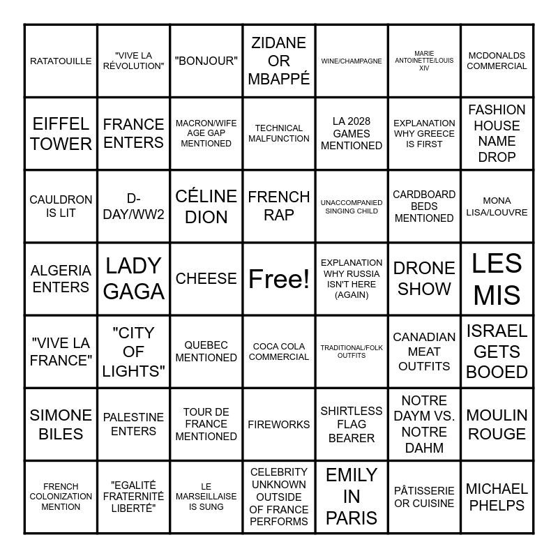 This bingo card has a free space and 48 words: SHIRTLESS FLAG BEARER, EXPLANATION WHY GREECE IS FIRST, CELEBRITY UNKNOWN OUTSIDE OF FRANCE PERFORMS, LADY GAGA, CÉLINE DION, LES MIS, "VIVE LA RÉVOLUTION", "EGALITÉ FRATERNITÉ LIBERTÉ", MARIE ANTOINETTE/LOUIS XIV, COCA COLA COMMERCIAL, MCDONALDS COMMERCIAL, ZIDANE OR MBAPPÉ, CARDBOARD BEDS MENTIONED, UNACCOMPANIED SINGING CHILD, SIMONE BILES, DRONE SHOW, EIFFEL TOWER, FASHION HOUSE NAME DROP, NOTRE DAYM VS. NOTRE DAHM, WINE/CHAMPAGNE, LA 2028 GAMES MENTIONED, CHEESE, RATATOUILLE, FRANCE ENTERS, MOULIN ROUGE, MACRON/WIFE AGE GAP MENTIONED, MONA LISA/LOUVRE, FRENCH COLONIZATION MENTION, FRENCH RAP, D-DAY/WW2, PÂTISSERIE OR CUISINE, EXPLANATION WHY RUSSIA ISN'T HERE (AGAIN), ISRAEL GETS BOOED, PALESTINE ENTERS, ALGERIA ENTERS, TRADITIONAL/FOLK OUTFITS, CANADIAN MEAT OUTFITS, CAULDRON IS LIT, QUEBEC MENTIONED, TOUR DE FRANCE MENTIONED, "VIVE LA FRANCE", MICHAEL PHELPS, "BONJOUR", LE MARSEILLAISE IS SUNG, TECHNICAL MALFUNCTION, FIREWORKS, "CITY OF LIGHTS" and EMILY IN PARIS.