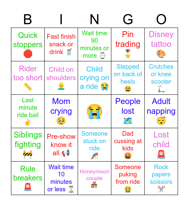 This bingo card has a free space and 24 words: Pre-show know it all 📢, Wait time 10 minutes or less ⌛️, Child crying on a ride 😭, Rule breakers 🚨, Disney tattoo 🎨, Quick stoppers 🛑, Rider too short 📏, Fast finish snack or drink 🥤, People lost 🗺, Someone stuck on ride 🎢, Stepped on back of heels 😫, Last minute ride bail ✌️, Dad cussing at kids 🤬, Lost child 🚨, Child on shoulders 👱♂️, Someone puking from ride 🤮, Adult napping 😴, Wait time 90 minutes or more ⌚️, Crutches or knee scooter 🛴, Mom crying 🥹, Rock papers scissors ✂️, Siblings fighting 🚧, Pin trading 🎖 and Honeymoon couple 👩❤️👨.