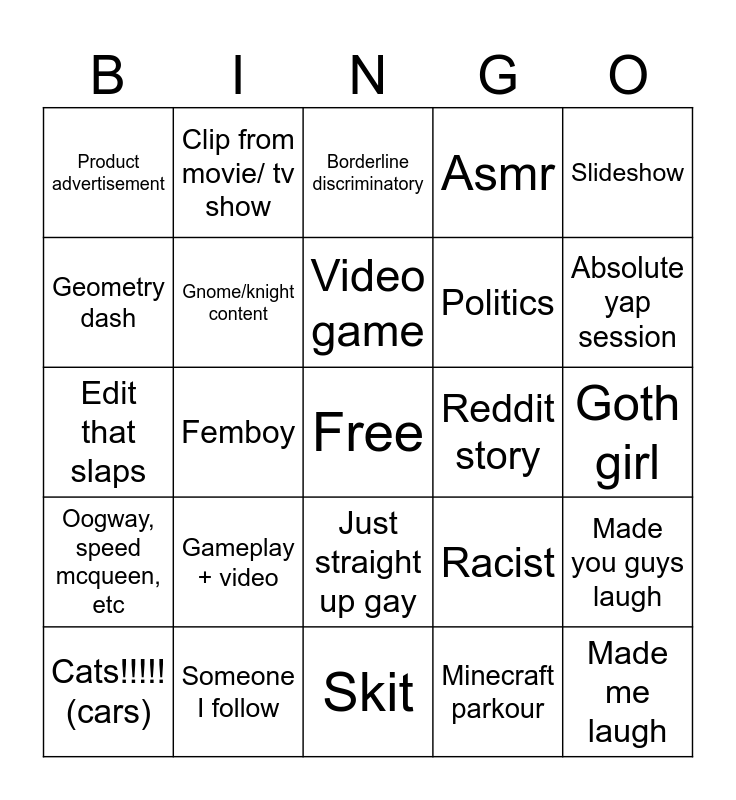 This bingo card has a free space and 24 words: Gameplay + video, Someone I follow, Video game, Cats!!!!! (cars), Slideshow, Product advertisement, Geometry dash, Clip from movie/ tv show, Reddit story, Just straight up gay, Politics, Edit that slaps, Racist, Made you guys laugh, Gnome/knight content, Minecraft parkour, Goth girl, Borderline discriminatory, Absolute yap session, Femboy, Made me laugh, Oogway, speed mcqueen, etc, Asmr and Skit.