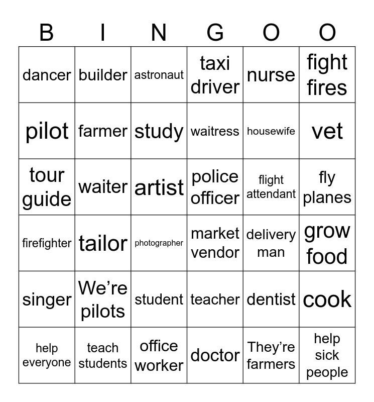 This bingo card has 36 words: teacher, student, doctor, pilot, firefighter, police officer, farmer, office worker, nurse, dentist, vet, taxi driver, cook, waiter, waitress, dancer, singer, flight attendant, tour guide, astronaut, artist, tailor, market vendor, photographer, delivery man, builder, housewife, teach students, study, fight fires, help sick people, help everyone, grow food, fly planes, We’re pilots and They’re farmers.