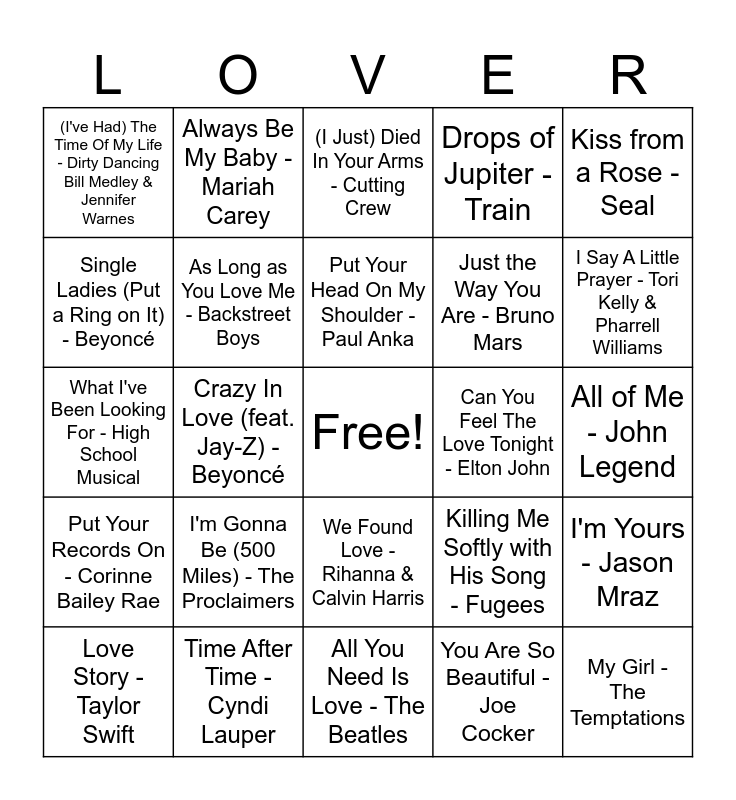 This bingo card has a free space and 69 words: a thousand years - Christina Perri, All of Me - John Legend, I Will Always Love You - Whitney Houston, She Will Be Loved - Maroon 5, Time After Time - Cyndi Lauper, At Last - Etta James, Drops of Jupiter - Train, Kiss Me - Sixpence None the Richer, Kiss from a Rose - Seal, Make You Feel My Love - Adele, I'm Yours - Jason Mraz, 2 Become 1 - Spice Girls, (I've Had) The Time Of My Life - Dirty Dancing Bill Medley & Jennifer Warnes, (I Just) Died In Your Arms - Cutting Crew, Perfect - Ed Sheeran, Crazy In Love (feat. Jay-Z) - Beyoncé, We Found Love - Rihanna & Calvin Harris, Just the Way You Are - Bruno Mars, L-O-V-E - Nat King Cole, Put Your Records On - Corinne Bailey Rae, Can You Feel The Love Tonight - Elton John, Killing Me Softly with His Song - Fugees, I Say A Little Prayer - Tori Kelly & Pharrell Williams, A Thousand Miles - Vanessa Carlton, You Are the Best Thing - Ray LaMontagne, First Date - blink-182, The Way I Am - Ingrid Michaelson, My Heart Will Go On - Céline Dion, You Are So Beautiful - Joe Cocker, Can't Help Falling In Love - Elvis Presley, Always Be My Baby - Mariah Carey, Take My Breath Away - Berlin, Truly Madly Deeply - Savage Garden, Wannabe - Spice Girls, What Is Love (7" Mix) - Haddaway, Killing Me Softly With His Song - Fugees, Just the Way You Are - Bruno Mars, Can't Take My Eyes off You - Frankie Valli, Single Ladies (Put a Ring on It) - Beyoncé, Too Sweet - Hozier, I'm Gonna Be (500 Miles) - The Proclaimers, My Girl - The Temptations, Lucky - Jason Mraz & Colbie Caillat, Hey There Delilah - Plain White T's, You're Beautiful - James Blunt, Love Story - Taylor Swift, Wonderwall - Oasis, This I Promise You - *NSYNC, Cool Rider - Michelle Pfeiffer, As Long as You Love Me - Backstreet Boys, Put Your Head On My Shoulder - Paul Anka, Head Over Feet - Alanis Morissette, Fallin' - Alicia Keys, All You Need Is Love - The Beatles, My Guy - Mary Wells, Love You Like a Love Song - Selena Gomez & The Scene, What Makes You Beautiful - One Direction, I Got You Babe - Sonny & Cher, As Long as You Love Me (feat. Big Sean) - Justin Bieber, What I've Been Looking For - High School Musical, You're The One That I Want - Grease, Somebody To Love - Queen, Ain't No Mountain High Enough - Marvin Gaye & Tammi Terrell, I'll Cover You -RENT, Beauty and the Beast - Angela Lansbury, Love Is an Open Door - Frozen, Kiss the Girl - Samuel E. Wright, A Girl Worth Fighting For - Mulan and A Whole New World - Aladdin.