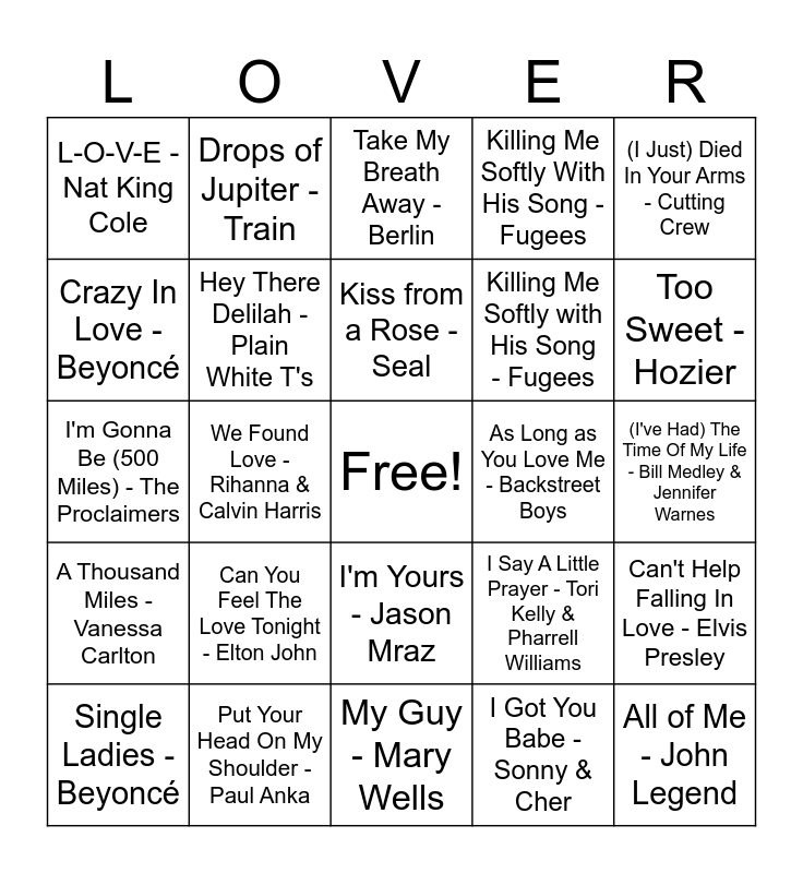 This bingo card has a free space and 68 words: a thousand years - Christina Perri, All of Me - John Legend, I Will Always Love You - Whitney Houston, She Will Be Loved - Maroon 5, Time After Time - Cyndi Lauper, At Last - Etta James, Drops of Jupiter - Train, Kiss Me - Sixpence None the Richer, Kiss from a Rose - Seal, Make You Feel My Love - Adele, I'm Yours - Jason Mraz, 2 Become 1 - Spice Girls, (I've Had) The Time Of My Life - Bill Medley & Jennifer Warnes, (I Just) Died In Your Arms - Cutting Crew, Perfect - Ed Sheeran, Crazy In Love - Beyoncé, We Found Love - Rihanna & Calvin Harris, L-O-V-E - Nat King Cole, Put Your Records On - Corinne Bailey Rae, Can You Feel The Love Tonight - Elton John, Killing Me Softly with His Song - Fugees, I Say A Little Prayer - Tori Kelly & Pharrell Williams, A Thousand Miles - Vanessa Carlton, You Are the Best Thing - Ray LaMontagne, First Date - blink-182, The Way I Am - Ingrid Michaelson, My Heart Will Go On - Céline Dion, You Are So Beautiful - Joe Cocker, Can't Help Falling In Love - Elvis Presley, Always Be My Baby - Mariah Carey, Take My Breath Away - Berlin, Truly Madly Deeply - Savage Garden, Wannabe - Spice Girls, What Is Love - Haddaway, Killing Me Softly With His Song - Fugees, Just the Way You Are - Bruno Mars, Can't Take My Eyes off You - Frankie Valli, Single Ladies - Beyoncé, Too Sweet - Hozier, I'm Gonna Be (500 Miles) - The Proclaimers, My Girl - The Temptations, Lucky - Jason Mraz & Colbie Caillat, Hey There Delilah - Plain White T's, You're Beautiful - James Blunt, Love Story - Taylor Swift, Wonderwall - Oasis, This I Promise You - *NSYNC, Cool Rider - Grease 2, As Long as You Love Me - Backstreet Boys, Put Your Head On My Shoulder - Paul Anka, Head Over Feet - Alanis Morissette, Fallin' - Alicia Keys, All You Need Is Love - The Beatles, My Guy - Mary Wells, Love You Like a Love Song - Selena Gomez & The Scene, What Makes You Beautiful - One Direction, I Got You Babe - Sonny & Cher, As Long as You Love Me - Justin Bieber, What I've Been Looking For - High School Musical, You're The One That I Want - Grease, Somebody To Love - Queen, Ain't No Mountain High Enough - Marvin Gaye & Tammi Terrell, I'll Cover You - RENT, Beauty and the Beast - Beauty and the Beast, Love Is an Open Door - Frozen, Kiss the Girl - Little Mermaid, A Girl Worth Fighting For - Mulan and A Whole New World - Aladdin.