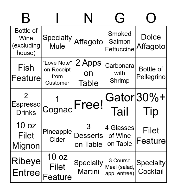 This bingo card has a free space and 24 words: Pineapple Cider, 10 oz Filet Feature, 2 Apps on Table, Ribeye Entree, Dolce Affagoto, Bottle of Wine (excluding house), Fish Feature, Specialty Mule, Gator Tail, 3 Desserts on Table, Carbonara with Shrimp, 2 Espresso Drinks, 4 Glasses of Wine on Table, Filet Feature, "Love Note" on Receipt from Customer, 3 Course Meal (salad, app, entree), 30%+ Tip, Affagoto, Bottle of Pellegrino, 1 Cognac, Specialty Cocktail, 10 oz Filet Mignon, Smoked Salmon Fettuccine and Specialty Martini.