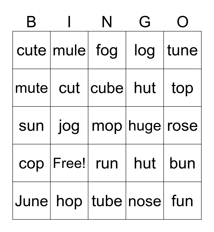 This bingo card has 25 words: Free!, tube, cube, June, tune, cute, mute, mule, huge, run, hut, sun, hut, bun, cut, fun, rose, fog, top, jog, mop, hop, cop, log and nose.