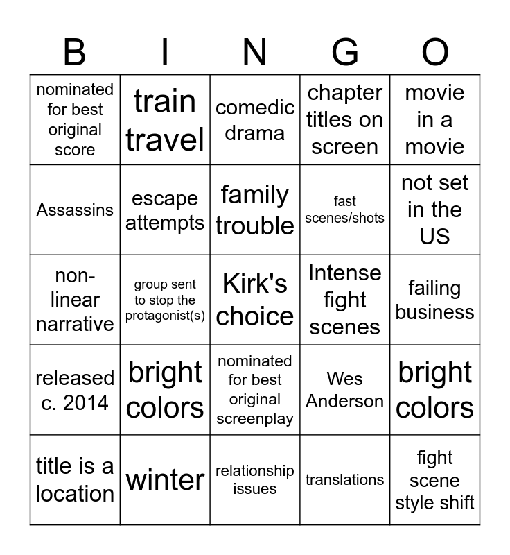 This bingo card has a free space and 24 words: bright colors, winter, family trouble, title is a location, movie in a movie, nominated for best original score, Assassins, train travel, Intense fight scenes, nominated for best original screenplay, fast scenes/shots, non-linear narrative, Wes Anderson, bright colors, escape attempts, translations, failing business, comedic drama, not set in the US, group sent to stop the protagonist(s), fight scene style shift, released c. 2014, chapter titles on screen and relationship issues.
