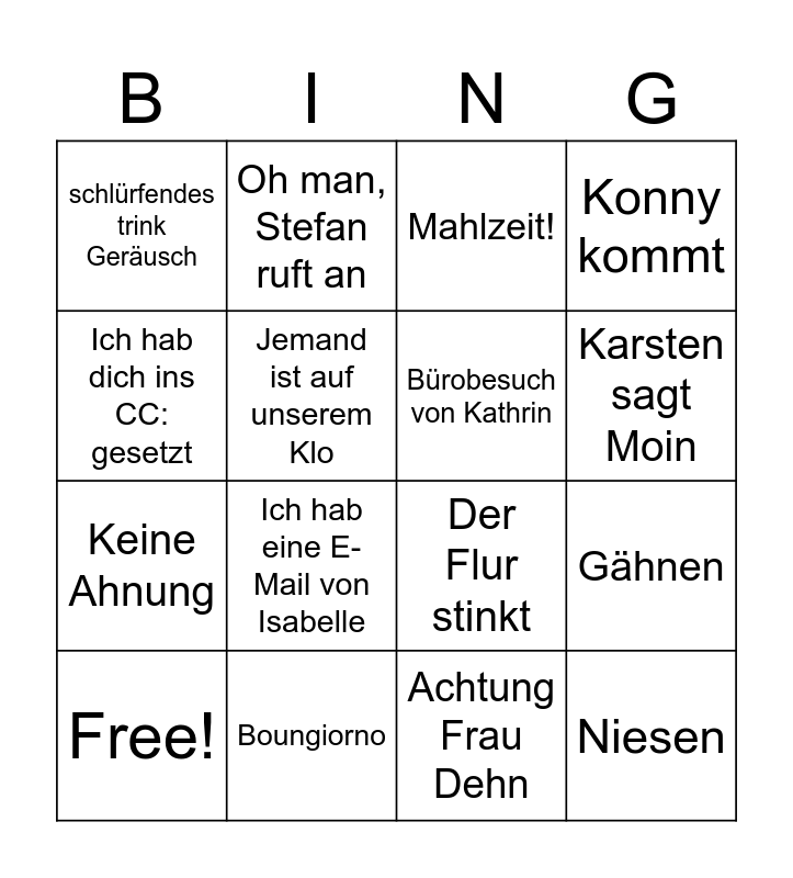 This bingo card has 16 words: Boungiorno, Gähnen, Mahlzeit!, schlürfendes trink Geräusch, Keine Ahnung, Oh man, Stefan ruft an, Der Flur stinkt, Achtung Frau Dehn, Ich hab dich ins CC: gesetzt, Jemand ist auf unserem Klo, Free!, Konny kommt, Ich hab eine E-Mail von Isabelle, Karsten sagt Moin, Bürobesuch von Kathrin and Niesen.