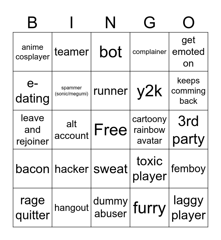 This bingo card has a free space and 26 words: sweat, furry, runner, hangout, get emoted on, anime cosplayer, e-dating, teamer, 3rd party, toxic player, y2k, leave and rejoiner, femboy, rage quitter, alt account, 5k kills, complainer, bacon, bot, laggy player, keeps comming back, dummy abuser, cartoony rainbow avatar, hacker, spammer (sonic/megumi) and lucky player.