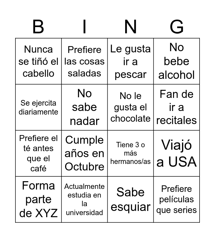 This bingo card has 86 words: Toca algún instrumento, Tiene mas de 2 hermanos, Vivió en otro país, Hizo un Work&Travel, Es fan de Harry Potter, Ama a los animales, Es fan de los deportes, Le gusta cocinar, Es vegetariano/vegano, Es adict@ a las compras, Le gusta bailar, Está estudiando, Es fan del futbol/ir a la cancha, Sabe esquiar, Se tiñó el pelo de colores, Fan de ir a recitales, Siempre es el asador, Tiene un "millon de amigos", Hace pilates, Es pasteler@, Miró una serie en una noche, Viajó en crucero, Tiene 3 o más hermanos/as, Viajó al exterior +3 veces, Conoce +5 paises, Habla un tercer idioma, Ha ganado un trofeo, Fue al concierto de Coldplay, Le gusta ir a acampar, Tiene tatuajes, Tiene piercings, Tene una foto con algun famoso, No le gusta el café, Es aracnofóbico, No sabe nadar, Nació en otra provincia, Cumple años en Octubre, Vio Game of Thrones completa, Nunca subió a una montaña rusa, Viajó a USA, Viene a trabajar en tren, Disfruta obras en el Teatro Colon, Le gusta el sushi, Actualmente estudia en la universidad, Dibuja muy bien, Se ejercita diariamente, Ha patinado sobre hielo, Prefiere las cosas saladas, Prefiere las cosas dulces, Ha visto la misma película más de 5 veces, Sabe cantar, Prefiere series que películas, Prefiere películas que series, Sabe leer el tarot, Prefiere montaña antes que playa, Prefiere playa antes que montaña, Le encantan los museos de arte, Prefiere el té antes que el café, No bebe alcohol, No le gusta el chocolate, Nunca se tiñó el cabello, Ha viajado a Europa, Nunca ha viajado en avión, Hizo bungee jumping, Hizo snorkel, Le gusta ir a pescar, Forma parte del Digital, Forma parte de XYZ, Forma parte de Pride, Forma parte de Awen, Es contador/a, Es licenciado/a en Admin., No es de Boca ni de River, Viajó para ver en vivo algún partido de la Selección, Está estudiando una segunda carrera universitaria, Nacio fuera de Argentina, Usa lentes para ver, No le gusta el dulce de leche, Viajo en alguna migracion de Chevron, Fue a la visita de YPF, Donó sangre, Es casad@, Es celiaco/intolerante al gluten, Hizo un curso de ceramica, Tiene dos carreras universitarias and Es herman@ mayor.