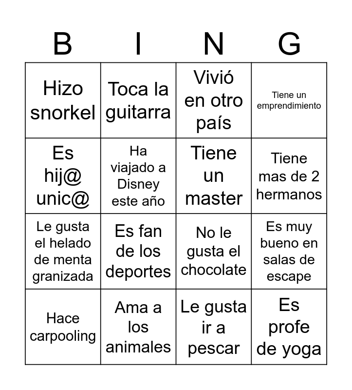 This bingo card has 34 words: Tiene menos de 1 año en la empresa, Corre maratones, Vivio en China, Es cantante, Es profe de yoga, Tiene un master, Es hij@ unic@, Tiene 2 gatos, Toca la guitarra, Toca algún instrumento, Tiene mas de 2 hermanos, Vivió en otro país, Hizo un Work&Travel, Es fan de Harry Potter, Ama a los animales, Es fan de los deportes, Le gusta cocinar, No le gusta el chocolate, Nunca se tiñó el cabello, Ha viajado a Europa, Nunca ha viajado en avión, Hizo bungee jumping, Hizo snorkel, Le gusta ir a pescar, Vio Intensamente 2 en el cine, Hace carpooling, Tiene un emprendimiento, Le gusta la pizza de ananá, Le gusta el helado de menta granizada, Ha viajado a Disney este año, Sabe artes marciales, Es muy bueno en salas de escape, Ganó dinero en el casino and No sabe andar en bicicleta.