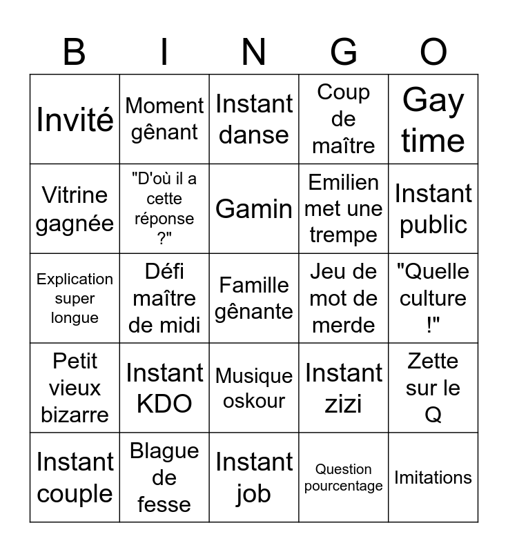 This bingo card has 25 words: Instant KDO, Instant job, Gamin, Instant couple, Gay time, Invité, Vitrine gagnée, Moment gênant, Jeu de mot de merde, Musique oskour, Emilien met une trempe, Explication super longue, Instant zizi, Zette sur le Q, "D'où il a cette réponse ?", Imitations, "Quelle culture !", Instant danse, Instant public, Défi maître de midi, Famille gênante, Blague de fesse, Petit vieux bizarre, Coup de maître and Question pourcentage.