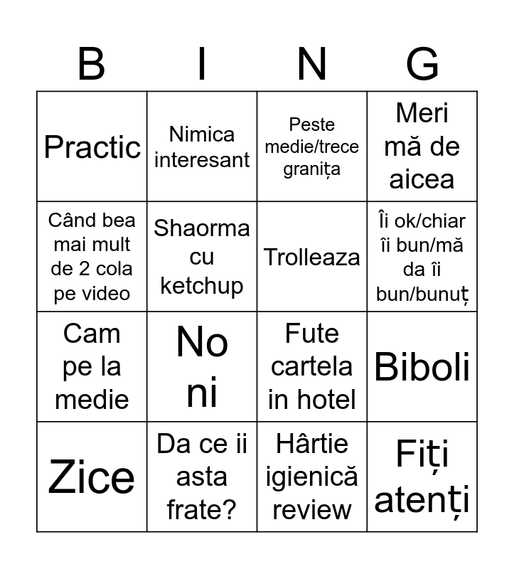 This bingo card has 18 words: No ni, Fiți atenți, Peste medie/trece granița, Practic, Fute cartela in hotel, Meri mă de aicea, Zice, Nimica interesant, Îi ok/chiar îi bun/mă da îi bun/bunuț, Cam pe la medie, Hârtie igienică review, Când bea mai mult de 2 cola pe video, Biboli, Shaorma cu ketchup, Trolleaza, Când face o secundă de sport, Da ce ii asta frate? and "merem".