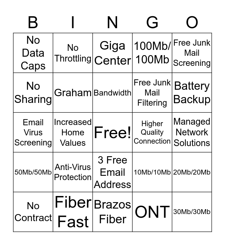 This bingo card has a free space and 24 words: Anti-Virus Protection, Fiber Fast, Bandwidth, No Contract, Free Junk Mail Screening, No Data Caps, No Sharing, No Throttling, Higher Quality Connection, 3 Free Email Address, Free Junk Mail Filtering, Email Virus Screening, 10Mb/10Mb, 20Mb/20Mb, Graham, ONT, Managed Network Solutions, Giga Center, Battery Backup, Increased Home Values, 30Mb/30Mb, 50Mb/50Mb, 100Mb/ 100Mb and Brazos Fiber.