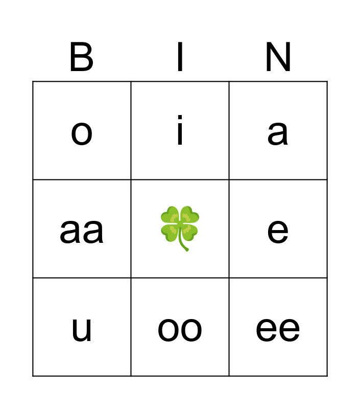 This bingo card has a free space and 8 words: e, a, i, u, o, ee, aa and oo.