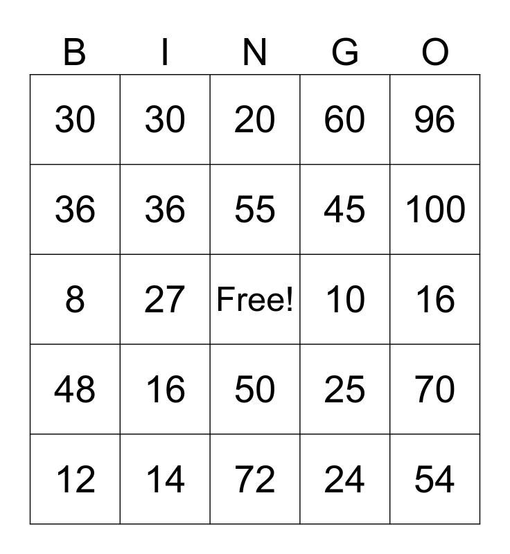 This bingo card has a free space and 29 words: 12, 15, 27, 40, 30, 20, 36, 16, 10, 14, 16, 54, 72, 24, 100, 32, 50, 48, 96, 8, 25, 35, 45, 36, 60, 30, 70, 55 and 80.