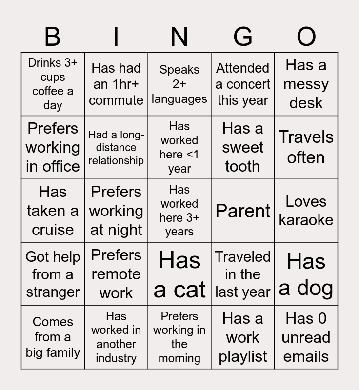 This bingo card has a free space and 24 words: Prefers remote work, Has worked in another industry, Has worked here <1 year, Comes from a big family, Has a messy desk, Drinks 3+ cups coffee a day, Prefers working in office, Has had an 1hr+ commute, Parent, Has a cat, Has a sweet tooth, Has taken a cruise, Traveled in the last year, Has a dog, Had a long-distance relationship, Has a work playlist, Loves karaoke, Speaks 2+ languages, Travels often, Prefers working at night, Has 0 unread emails, Got help from a stranger, Attended a concert this year and Prefers working in the morning.