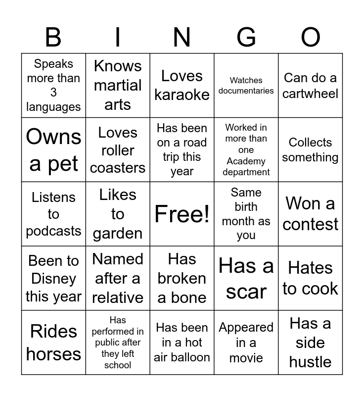 This bingo card has a free space and 34 words: Knows ASL, Appeared in a movie, Met a celebrity, Likes pineapple on pizza, Been to Disney this year, Loves roller coasters, Can do a cartwheel, Rides horses, Knows martial arts, Attended a concert this year, Has been on a road trip this year, Loves karaoke, Good at escape rooms, Wearing funny socks, Same birth month as you, Collects something, Has performed in public after they left school, Listens to podcasts, Named after a relative, Has a scar, Has broken a bone, Has a nickname, Speaks more than 3 languages, Won a contest, Has been in a hot air balloon, Has a side hustle, Watches documentaries, Knows calligraphy/hand lettering, Worked in more than one Academy department, Owns a pet, Doesn’t own a car, Likes to garden, Hates to cook and Procrastinates by cleaning.