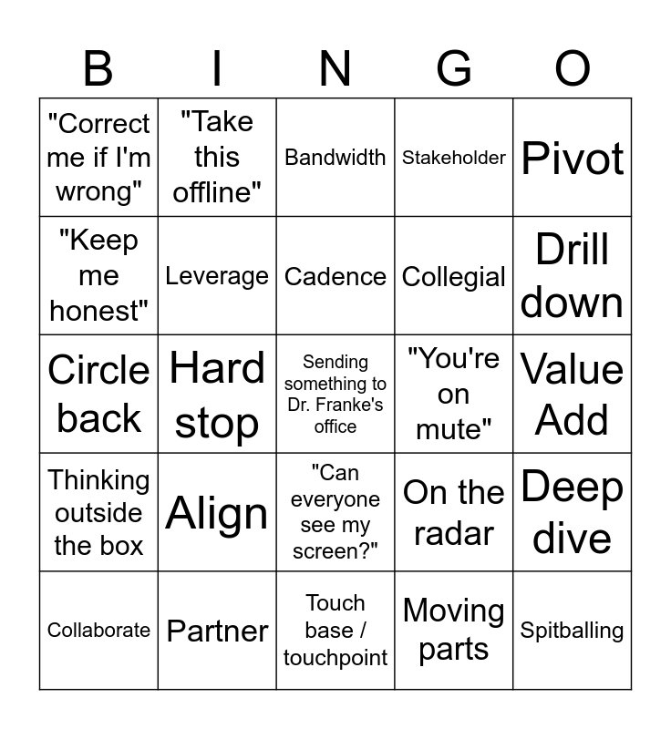 This bingo card has a free space and 24 words: Align, Partner, Cadence, Collaborate, Pivot, "Correct me if I'm wrong", "Keep me honest", "Take this offline", "You're on mute", "Can everyone see my screen?", Collegial, Circle back, On the radar, Deep dive, Leverage, Moving parts, Value Add, Bandwidth, Drill down, Hard stop, Spitballing, Thinking outside the box, Stakeholder and Touch base / touchpoint.