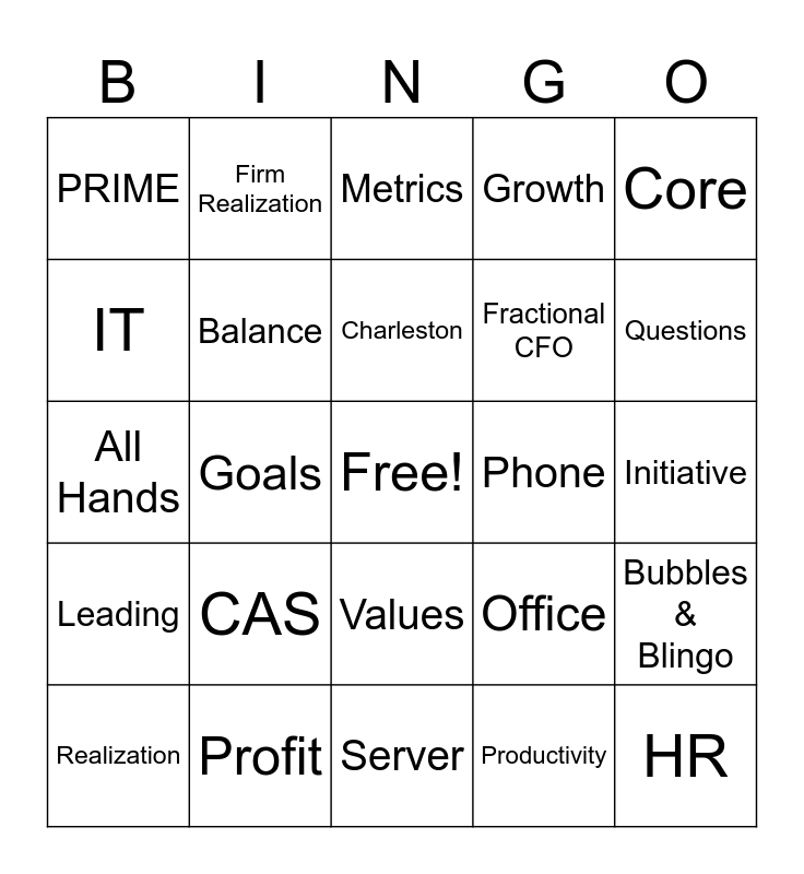 This bingo card has a free space and 38 words: 120%, 130%, Audit, Balance, Bubbles & Blingo, CAS, Charleston, Community, Core, Fractional CFO, Goals, Growth, HR, Initiative, IT, Leading, Margin, Metrics, Mission, Phone, PRIME, Profit, Questions, Realization, Reliability, Server, Summer, T9 Text, Tax, Tax Summit, Team, Values, Productivity, Firm Realization, Support Staff, Office, All Hands and Welcome.