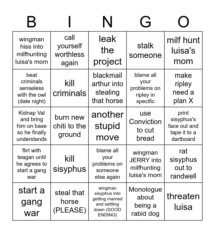 This bingo card has a free space and 24 words: kill sisyphus, steal that horse (PLEASE), blackmail arthur into stealing that horse, start a gang war, milf hunt luisa's mom, wingman hiss into milfhunting luisa's mom, beat criminals senseless with the owl (date night), call yourself worthless again, use Conviction to cut bread, blame all your problems on someone else again, blame all your problems on ripley in specific, Kidnap Val and bring him on base so he finally understands, wingman JERRY into milfhunting luisa's mom, rat sisyphus out to randwell, kill criminals, Monologue about being a rabid dog, print sisyphus's face out and tape it to a dartboard, leak the project, make ripley need a plan X, burn new chiti to the ground, threaten luisa, flirt with teagan until he agrees to start a gang war, stalk someone and wingman sisyphus into getting married and settling down (GOOD ENDING).