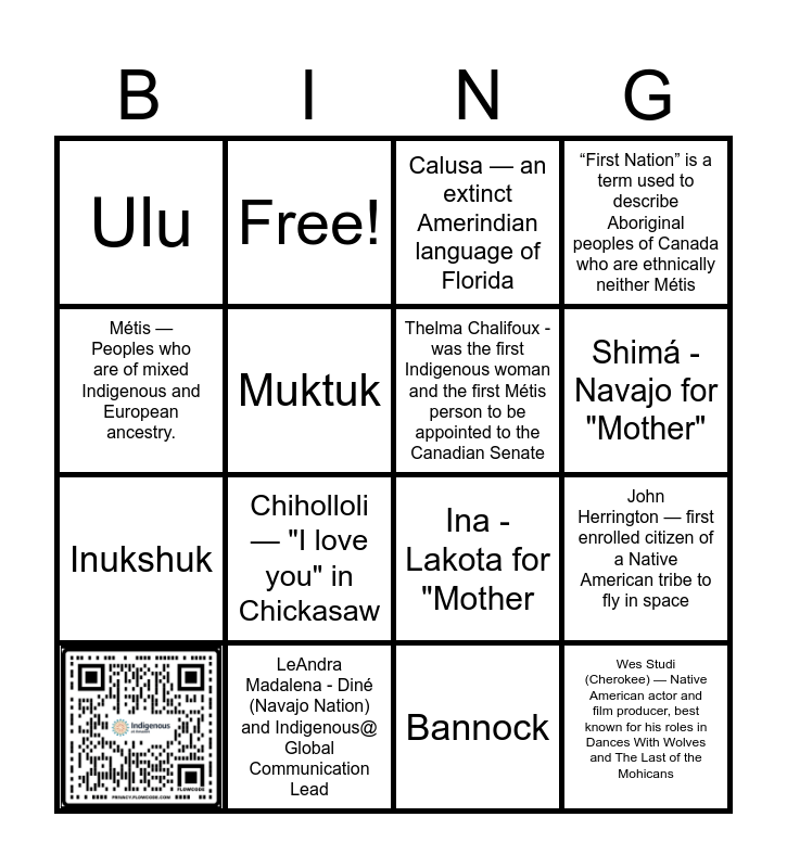 This bingo card has 2 images and 17 words: Ina - Lakota for "Mother, Indigenous — term used to encompass a variety of Aboriginal groups. It is most frequently used in an international, transnational, or global context., Calusa — an extinct Amerindian language of Florida, Wes Studi (Cherokee) — Native American actor and film producer, best known for his roles in Dances With Wolves and The Last of the Mohicans, John Herrington — first enrolled citizen of a Native American tribe to fly in space, Métis — Peoples who are of mixed Indigenous and European ancestry., Bannock, Ulu, Free!, Inukshuk, Chiholloli — "I love you" in Chickasaw, Muktuk, Thelma Chalifoux - was the first Indigenous woman and the first Métis person to be appointed to the Canadian Senate, LeAndra Madalena - Diné (Navajo Nation) and Indigenous@ Global Communication Lead, “First Nation” is a term used to describe Aboriginal peoples of Canada who are ethnically neither Métis, Shimá - Navajo for "Mother" and November 2024 – Native Heritage Month.