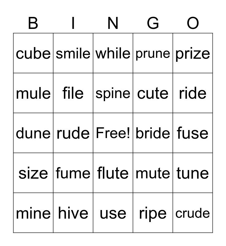 This bingo card has a free space and 34 words: chime, ripe, white, vine, size, file, prize, mine, smile, hide, spine, while, slide, five, bride, ride, hive, dune, fume, mute, flute, rule, cube, fuse, use, crude, prune, tube, cute, mule, flume, rude, tune and June.