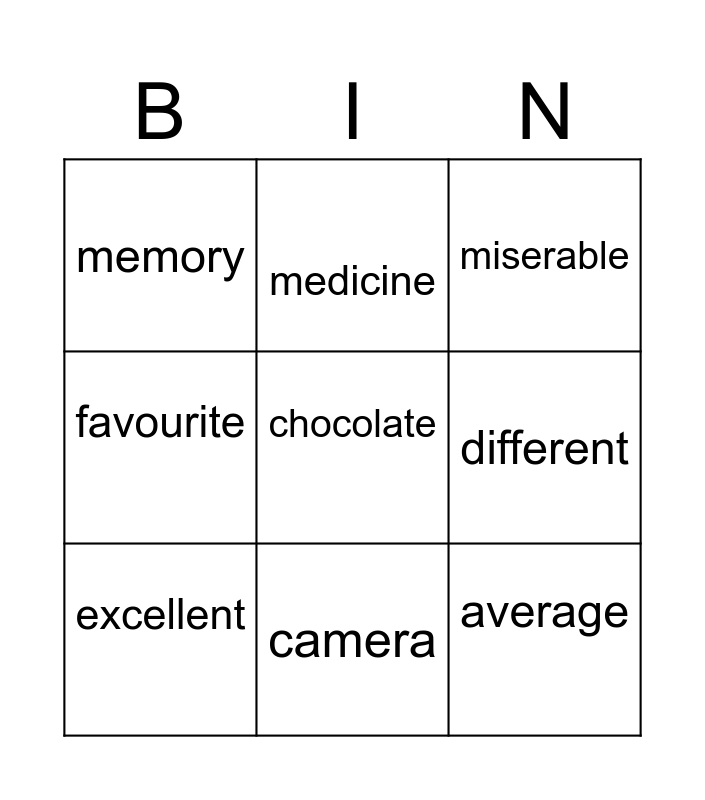 This bingo card has 13 words: every, opera, excellent, medicine, favourite, chocolate, average, delivery, camera, memory, different, miserable and happening.