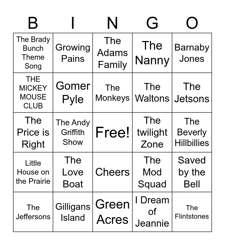 This bingo card has a free space and 30 words: Gilligans Island, Good Times, The Andy Griffith Show, Hawaii Five-O, The Brady Bunch Theme Song, The Adams Family, Gomer Pyle, Cheers, The twilight Zone, Green Acres, The Beverly Hillbillies, The Flintstones, I Dream of Jeannie, Bonanza, The Jetsons, Different Strokes, The Mod Squad, Little House on the Prairie, The Love Boat, Barnaby Jones, The Price is Right, Alf, Growing Pains, The Waltons, THE MICKEY MOUSE CLUB, The Nanny, Saved by the Bell, The Jeffersons, The Monkeys and Scooby-Doo.