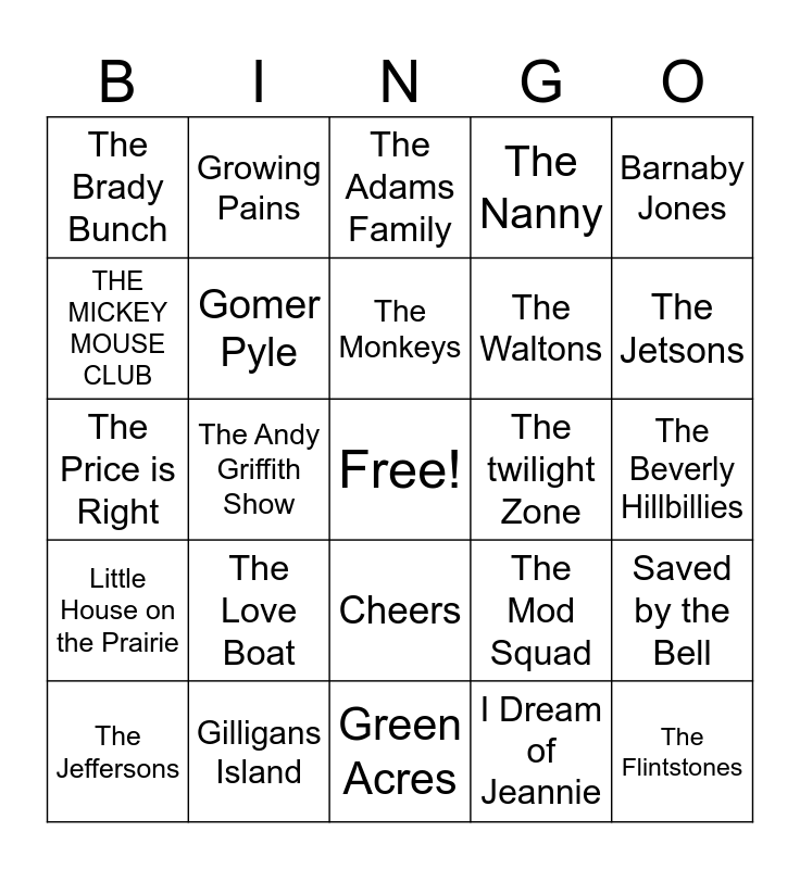 This bingo card has a free space and 30 words: Gilligans Island, Good Times, The Andy Griffith Show, Hawaii Five-O, The Brady Bunch, The Adams Family, Gomer Pyle, Cheers, The twilight Zone, Green Acres, The Beverly Hillbillies, The Flintstones, I Dream of Jeannie, Bonanza, The Jetsons, Different Strokes, The Mod Squad, Little House on the Prairie, The Love Boat, Barnaby Jones, The Price is Right, Alf, Growing Pains, The Waltons, THE MICKEY MOUSE CLUB, The Nanny, Saved by the Bell, The Jeffersons, The Monkeys and Scooby-Doo.