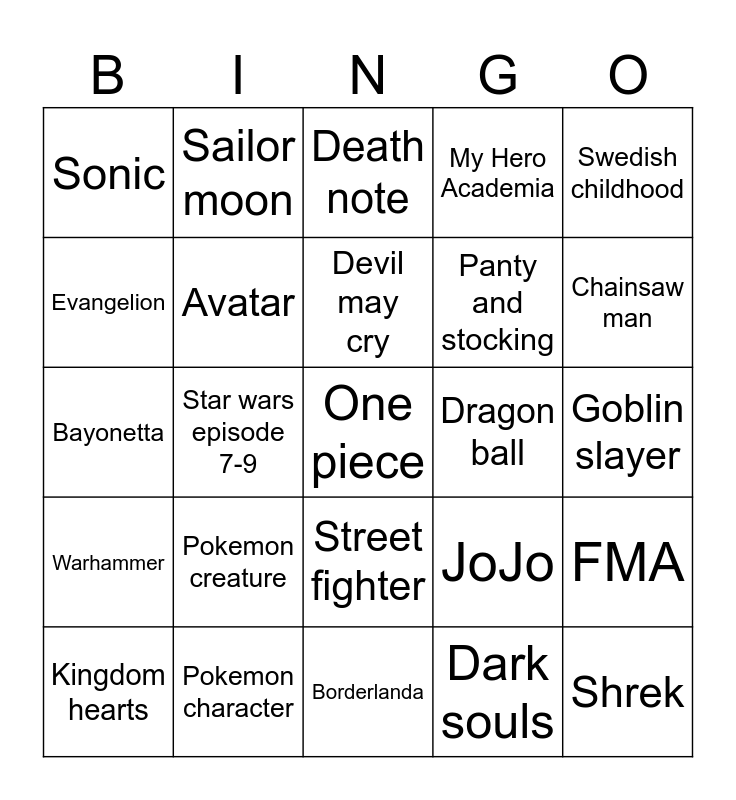 This bingo card has a free space and 24 words: Pokemon creature, Pokemon character, Devil may cry, Kingdom hearts, Swedish childhood, Sonic, Evangelion, Sailor moon, Dragon ball, Street fighter, Panty and stocking, Bayonetta, JoJo, FMA, Avatar, Dark souls, Goblin slayer, Death note, Chainsaw man, Star wars episode 7-9, Shrek, Warhammer, My Hero Academia and Borderlanda.