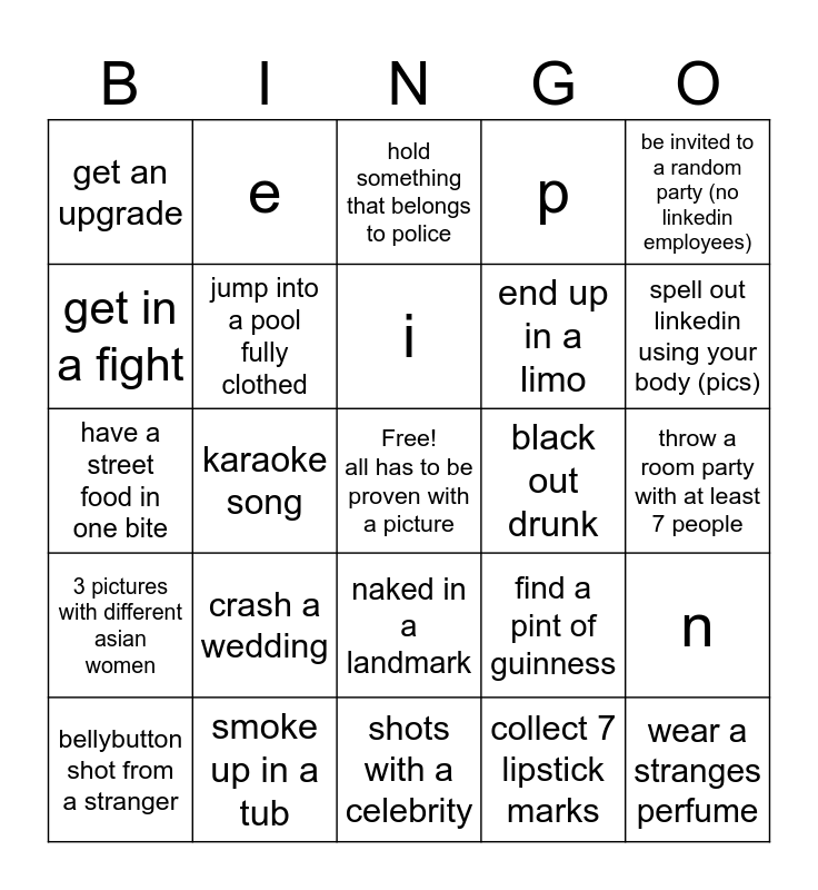 This bingo card has a free space and 29 words: bellybutton shot from a stranger, put at least 50 euro on black in a cassino, karaoke song, hold a gun, get an upgrade, hold something that belongs to police, jump into a pool fully clothed, crash a wedding, black out drunk, smoke up in a tub, throw a room party with at least 7 people, wear a stranges perfume, shots with a celebrity, collect 7 lipstick marks, spell out linkedin using your body (pics), say no to drugs, naked in a landmark, 3 pictures with different asian women, be invited to a random party (no linkedin employees), have a street food in one bite, find a pint of guinness, drive a supercar, end up in a limo, get in a fight, p, e, n, i and s.
