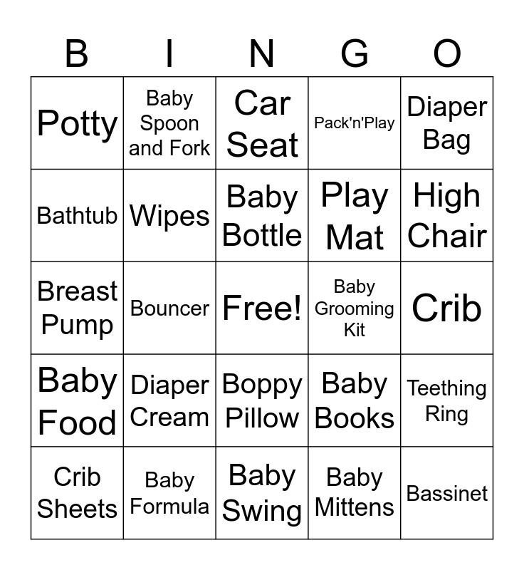 This bingo card has a free space and 37 words: Diapers, Pacifier, Socks, Wipes, Teething Ring, Diaper Cream, Baby Bottle, Breastmilk, Diaper Bag, Stroller, Bouncer, Pack'n'Play, Bassinet, Crib, Bathtub, Baby Food, Bibs, Car Seat, Boppy Pillow, Baby Grooming Kit, Potty, High Chair, Crib Sheets, Baby Swing, Baby Booties, Baby Mittens, Baby Spoon and Fork, Onesie, Baby Powder, Baby Shampoo, Baby Rattle, Baby Formula, Breast Pump, Baby Clothes, Baby Books, Play Mat and Baby Monitor.