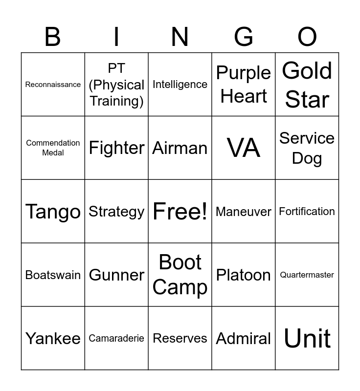 This bingo card has a free space and 75 words: Soldier, Sailor, Airman, Marine, Army, Navy, Air force, Space Force, Deployment, Bootcamp, Veteran, Military, Boot Camp, VA, Coast Guard, Commendation Medal, Camaraderie, Medal of Honor, OCONUS, Service Dog, Field Training, PT (Physical Training), Reserves, Purple Heart, Gold Star, Silver Star, Bronze Star, Homecoming, Achievement Medal, Uniform, MREs, Salute, Battalion, Platoon, Fortification, Reconnaissance, Division, Squadron, Maneuver, Unit, Patrol, Watch, Brigade, Regiment, Corps, Engagement, Strategy, Intelligence, Artillery, Tanks, Ships, Fighter, Firepower, Command, Infantry, Bunker, Submarines, Bombers, Choppers, Special Forces, Yankee, Victor, Zulu, Whiskey, Foxtrot, Tango, Logistics, Operations, Captain, Quartermaster, Boatswain, Gunner, Commodore, Admiral and General.