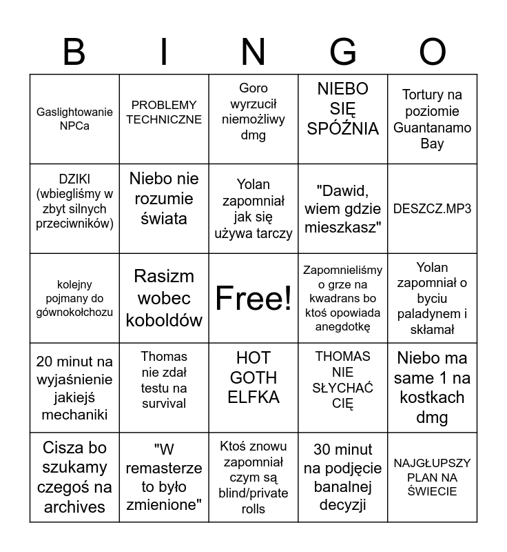 This bingo card has a free space and 24 words: Thomas nie zdał testu na survival, "W remasterze to było zmienione", Yolan zapomniał jak się używa tarczy, Cisza bo szukamy czegoś na archives, Tortury na poziomie Guantanamo Bay, Gaslightowanie NPCa, DZIKI (wbiegliśmy w zbyt silnych przeciwników), PROBLEMY TECHNICZNE, Zapomnieliśmy o grze na kwadrans bo ktoś opowiada anegdotkę, HOT GOTH ELFKA, "Dawid, wiem gdzie mieszkasz", kolejny pojmany do gównokołchozu, THOMAS NIE SŁYCHAĆ CIĘ, Niebo ma same 1 na kostkach dmg, Niebo nie rozumie świata, 30 minut na podjęcie banalnej decyzji, Yolan zapomniał o byciu paladynem i skłamał, Goro wyrzucił niemożliwy dmg, DESZCZ.MP3, Rasizm wobec koboldów, NAJGŁUPSZY PLAN NA ŚWIECIE, 20 minut na wyjaśnienie jakiejś mechaniki, NIEBO SIĘ SPÓŹNIA and Ktoś znowu zapomniał czym są blind/private rolls.