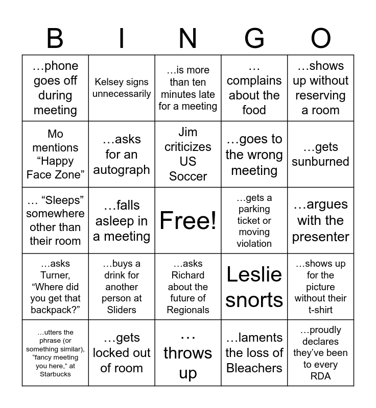 This bingo card has a free space and 36 words: Will swears on stage, …wears ref jersey or ref socks to fitness test, …mentions Green Latrine while on stage, …asks for an autograph, Leslie snorts, …asks Turner, “Where did you get that backpack?”, Jim criticizes US Soccer, …asks Dan about the brouhaha at Surf Cup NW, …shows up without reserving a room, …oversleeps and misses Fitness Test, …falls asleep in a meeting, …complains about the food, …is assigned a roommate of a different gender, …gets a parking ticket or moving violation, …gets sunburned, …phone goes off during meeting, …breaks/cracks/loses cell phone, …buys a drink for another person at Sliders, …proudly declares they’ve been to every RDA, …is more than ten minutes late for a meeting, …argues with the presenter, …shows up for the picture without their t-shirt, …gets locked out of room, …utters the phrase (or something similar), “fancy meeting you here,” at Starbucks, …throws up, Kelsey signs unnecessarily, … “Sleeps” somewhere other than their room, …leaves flags at field session, …goes to the wrong meeting, Mo mentions “Happy Face Zone”, Wain laughs at his own joke, …yells “mullllleeeee!”, …laments the loss of Bleachers, …asks Richard about the future of Regionals, …unscripted presentation bombs and …responds to “any questions” with a question.