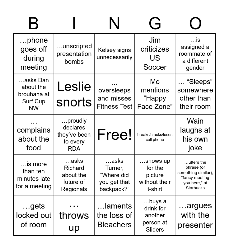 This bingo card has a free space and 35 words: Will swears on stage, …wears ref jersey or ref socks to fitness test, …asks for an autograph, Leslie snorts, …asks Turner, “Where did you get that backpack?”, Jim criticizes US Soccer, …asks Dan about the brouhaha at Surf Cup NW, …shows up without reserving a room, …oversleeps and misses Fitness Test, …falls asleep in a meeting, …complains about the food, …is assigned a roommate of a different gender, …gets a parking ticket or moving violation, …gets sunburned, …phone goes off during meeting, …breaks/cracks/loses cell phone, …buys a drink for another person at Sliders, …proudly declares they’ve been to every RDA, …is more than ten minutes late for a meeting, …argues with the presenter, …shows up for the picture without their t-shirt, …gets locked out of room, …utters the phrase (or something similar), “fancy meeting you here,” at Starbucks, …throws up, Kelsey signs unnecessarily, … “Sleeps” somewhere other than their room, …leaves flags at field session, …goes to the wrong meeting, Mo mentions “Happy Face Zone”, Wain laughs at his own joke, …yells “mullllleeeee!”, …laments the loss of Bleachers, …asks Richard about the future of Regionals, …unscripted presentation bombs and …responds to “any questions” with a question.