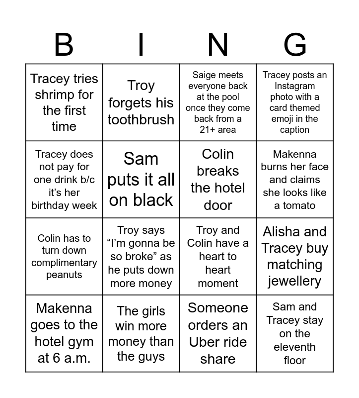 This bingo card has 76 words: Free!, Tracey redeems her free Starbucks drink, Saige meets everyone back at the pool once they come back from a 21+ area, Keenan stubs his toe, The girls buy matching shirts, Colin loses $100, Saige and/or Keenan say they miss their dog, Saige complains about Bobbi Joe, Sam and Tracey show up late for breakfast, Makenna complains about her garage, Troy and Alisha become friends with a middle aged couple in the hot tub, Troy punches a wall after losing at the slot machines, Makenna burns her face and claims she looks like a tomato, Sam puts it all on black, Keenan stays back with Saige and complains to Colin about it, Alisha and Tracey buy matching jewellery, Tracey makes Sam buy her a nice top she sees, Makenna goes to the hotel gym at 6 a.m., Tracey orders a margarita, Tracey does not pay for one drink b/c it’s her birthday week, Alisha wins the jackpot, Troy and Colin have a heart to heart moment, Colin breaks the hotel door, Troy forgets his toothbrush, Tracey posts an Instagram photo with a card themed emoji in the caption, Troy posts a photo of the pool with the weather sticker on his snap story, Makenna and Colin get locked out of their room, Tracey orders chocolate cake, Keenan makes a comment about the bartender’s service, Alisha steals food from the restaurant/buffet, Troy texts Noah saying he needs to get down to Vegas asap bc it’s sick, The girls take a mirror selfie together, Sam and Tracey play cribbage, Makenna orders a round of shots for the girls, Troy says “I’m gonna be so broke” as he puts down more money, Colin has to turn down complimentary peanuts, Makenna pets a dog she sees on the street, Someone meets an Uber driver named Benny, Someone orders an Uber ride share, Everyone sings happy birthday to Tracey at 2 a.m., Keenan and Saige go to bed at 11, Colin makes a side bet with a rando, Makenna finds 5 dollars on the ground, Tracey takes a Polaroid, Saige wants to check out the wax museum, Sam gets taken out by 2 shots of fireball, Sam strikes up a conversation with a stranger for 5 mins, Tracey tries shrimp for the first time, Alisha covers 80% of the food bills, Sam falls off the slide in the playground, Alisha goes to the aquarium with Saige bc she feels bad she’s missing out, A rando yells “you have no soul” to Saige b/c she’s a ginger, The bartender rips off Colin, Saige falls in love with Shirley temple drinks, Sam and Tracey sit in row 18 on the plane, Someone kicks the back of Colin’s seat on the plane, Makenna checks for hidden cameras in the hotel room, Sam gets patted down at the airport, Makenna cries once, Someone complains about how the casino is probably a cest pool, Alisha posts a photo of her and Troy on her insta story, Troy wears a flamingo shirt, Colin thinks he lost his AirPods, Troy says “let’s do weed heheheh”, Troy FaceTimes his parents to show them the window view, Colin and Makenna get a bad hotel window view, The girls win more money than the guys, Tracey throws a coin in a fountain to make a wish, The girls do face masks and convince Sam and Colin to do one too, Keenan and Saige stay on the third floor, Sam gets convinced to show them all, Sam and Tracey stay on the eleventh floor, A street vendor almost convinces Makenna to buy a bracelet, Someone assigns Tracey a celebrity lookalike, Keenan tries to get a deal on drinks and Alisha takes a photo with the fake Eiffel Tower and pretends to hold it between her finger.