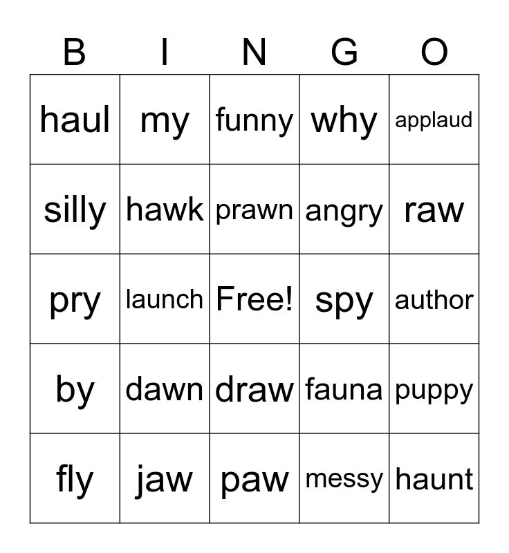 This bingo card has a free space and 28 words: puppy, happy, angry, messy, silly, funny, my, by, spy, fly, pry, why, jaw, paw, raw, lawn, dawn, hawk, prawn, draw, haul, maul, haunt, launch, author, fauna, applaud and dinosaur.