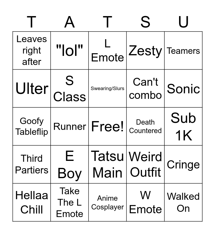 This bingo card has a free space and 39 words: Toxic, Sweaty, Trash, S Class, Hellaa Chill, Tatsu Main, Swearing/Slurs, E Girl, Teamers, Third Partiers, Runner, Zesty, Walked On, Sub 1K, Death Countered, E Boy, Diff Language, Leaves right after, Backshots, Weird Outfit, Ulter, Anime Cosplayer, Can't combo, Sonic, "Womp Womp", "ez", Changes Characters, bootleg afton, Brainrot, "lol", Salty, Targetter, L Emote, Take The L Emote, W Emote, Mid, Cringe, Goofy Tableflip and C O U N T E R.