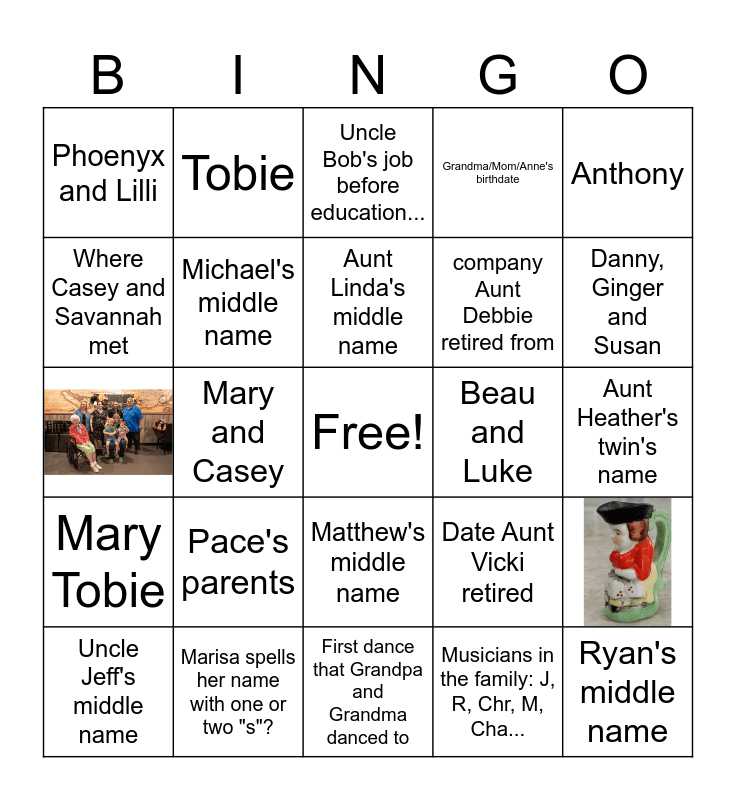 This bingo card has 2 images, a free space and 37 words: Asunta, Eli, 1898, Michael's middle name, Uncle Jeff's middle name, Matthew's middle name, Aunt Linda's middle name, had 3 brothers, Anthony, Mary Tobie, Mary and Casey, Grandma/Mom/Anne's birthdate, Ryan's middle name, Aunt Heather's twin's name, Beau and Luke, Pace's parents, Cayden and Myles, Phoenyx and Lilli, grade Meagan teaches, Date Aunt Vicki retired, Where Casey and Savannah met, First dance that Grandpa and Grandma danced to, company Aunt Debbie retired from, Danny, Ginger and Susan, Uncle Jim is James Joseph Opiekun the ___ (what number?), Tanya's summer job, Colyn met Meagan in __________., Christie has lived in how many states since graduating?, CJ's first name is ..., Tobie, Evan's expertise, DeConna, Uncle Bob's job before education..., Marisa spells her name with one or two "s"?, Musicians in the family: J, R, Chr, M, Cha..., born in Italy (2) and Matthew's middle name is _______.