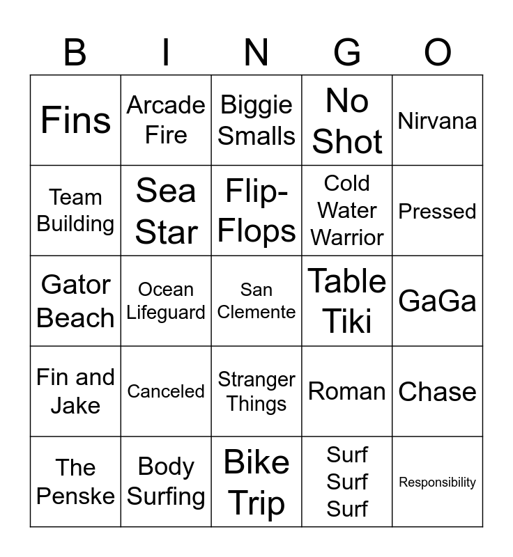 This bingo card has 101 words: Free!, Red Hot Chili Peppers, Nirvana, Patrick Mahomes, Kevin Hart, Lizzo, Will Ferrell, Among Us, Aura, Drake, Kendrick Lamar, Madelie Cline, SZA Dua Lipa, Jonas Brothers, Sus, Sabrina Carpenter, Fin and Jake, Patrick Star, Nicholas Cage, Pickle Rick, Brain Rot, Selena Gomez, Ariana Grande, The Weekend, Lowkey, Pressed, No Shot, Canceled, Travis Kelce, Childish Gambino, Arcade Fire, Biggie Smalls, TuPac, Napoleon Dynamite, Olivia Rodrigo, Stranger Things, Camp Surf, 8 foot Foamy, Surf Surf Surf, Bike Trip, Coronado, The Penske, Waterman, Mariners, California, San Clemente, Golden Broom, Honesty, Respect, Responsibility, Caring, Team Building, Climbing Wall, Archery, Arts/Crafts, Friendship Bracelets, Jetty, Shark, Dolphin, Octopus, Sea Star, Beach, Sunscreen, Sunnies, Wetsuit, Cold Water Warrior, Bodyboarding, Ocean Lifeguard, Body Surfing, Ocean Swim, Rescue Board, Surf Leash, Fins, Barefoot, Flip-Flops, Gator Beach, Mission Beach, MFBY, Trestles, San Clemente, Pier Walk, IB, Table Tiki, Beachcombers, Stingray Shuffle, S’moredilla’s, GaGa, Rice Krispie Treats, San O, Camping, Roman, Faith, Nick, Kate, Adriana, Chase, Juanita, Rip Current, Beach Flags, Water Bottle and Dance.
