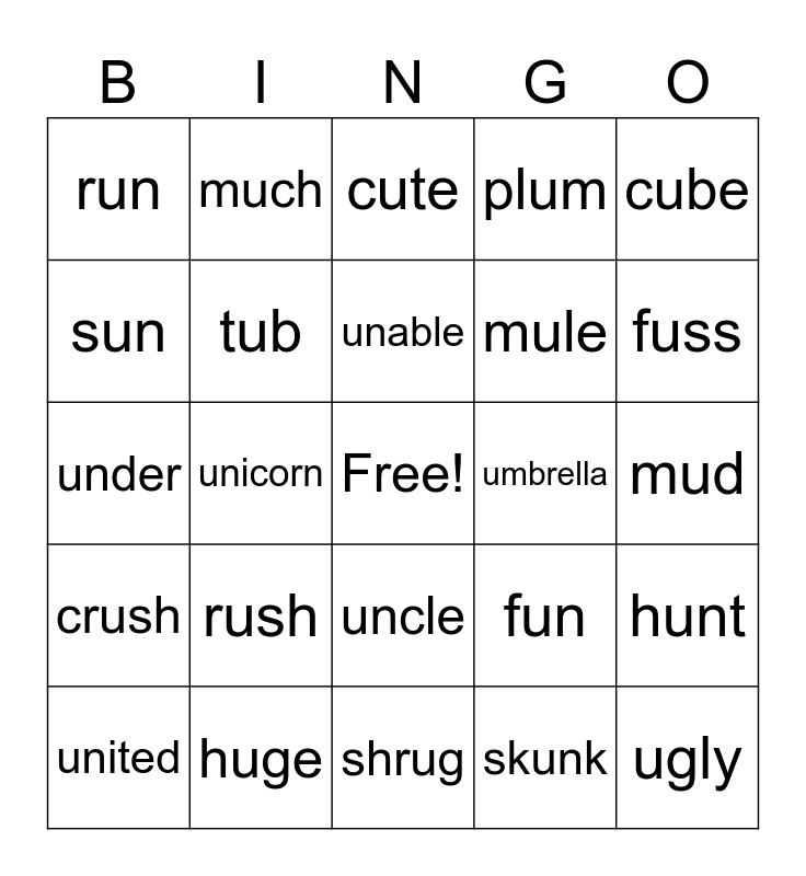 This bingo card has a free space and 24 words: rush, huge, unable, united, cube, run, sun, much, umbrella, uncle, mule, under, fun, hunt, tub, skunk, mud, cute, fuss, unicorn, ugly, crush, plum and shrug.