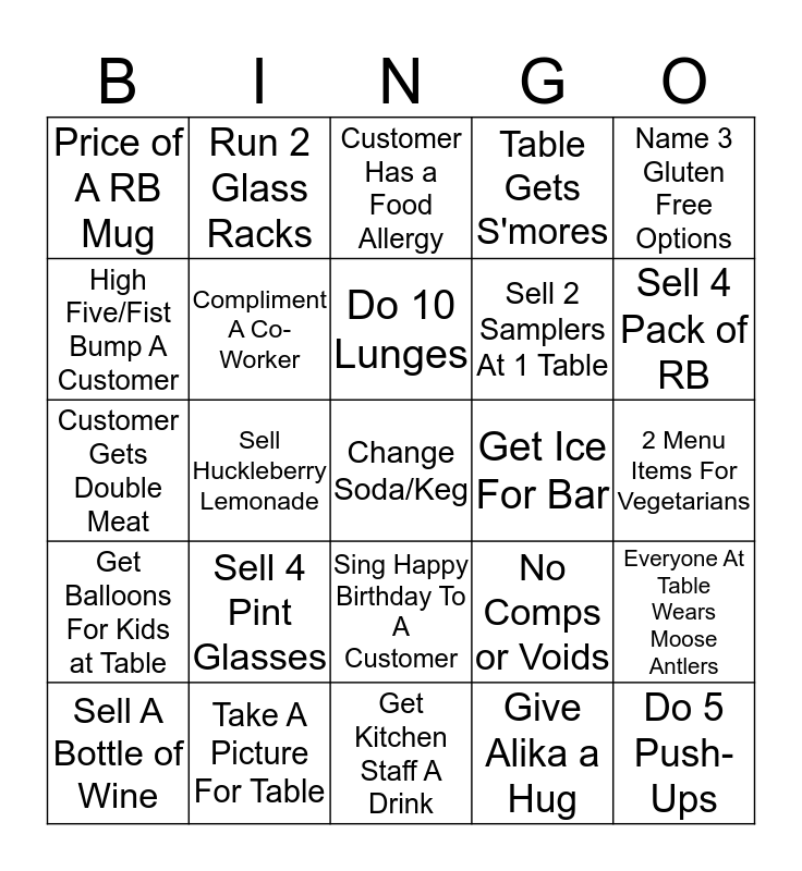 This bingo card has 25 words: Sell 4 Pint Glasses, Get Kitchen Staff A Drink, Do 10 Lunges, Sell A Bottle of Wine, Name 3 Gluten Free Options, Price of A RB Mug, High Five/Fist Bump A Customer, Run 2 Glass Racks, Get Ice For Bar, Sing Happy Birthday To A Customer, Sell 2 Samplers At 1 Table, Customer Gets Double Meat, No Comps or Voids, Everyone At Table Wears Moose Antlers, Compliment A Co-Worker, Do 5 Push-Ups, 2 Menu Items For Vegetarians, Customer Has a Food Allergy, Sell 4 Pack of RB, Sell Huckleberry Lemonade, Change Soda/Keg, Take A Picture For Table, Get Balloons For Kids at Table, Table Gets S'mores and Give Alika a Hug.