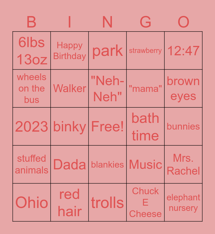 This bingo card has a free space and 38 words: Azarria, Aeriella, Ray, Walker, Mrs. Rachel, Dada, "Neh-Neh", 19 Inches, 12:47, "mama", binky, strawberry, elephant nursery, bunnies, wheels on the bus, stuffed animals, Springfield, park, rubber ducky, bath time, 6lbs 13oz, red hair, brown eyes, Ohio, cars, trolls, My Little Pony, Walks, Springfield Regional, dogs, cats, blankies, Chuck E Cheese, Happy Birthday, Curly Hair, Music, 2023 and Berry Cute Girl.
