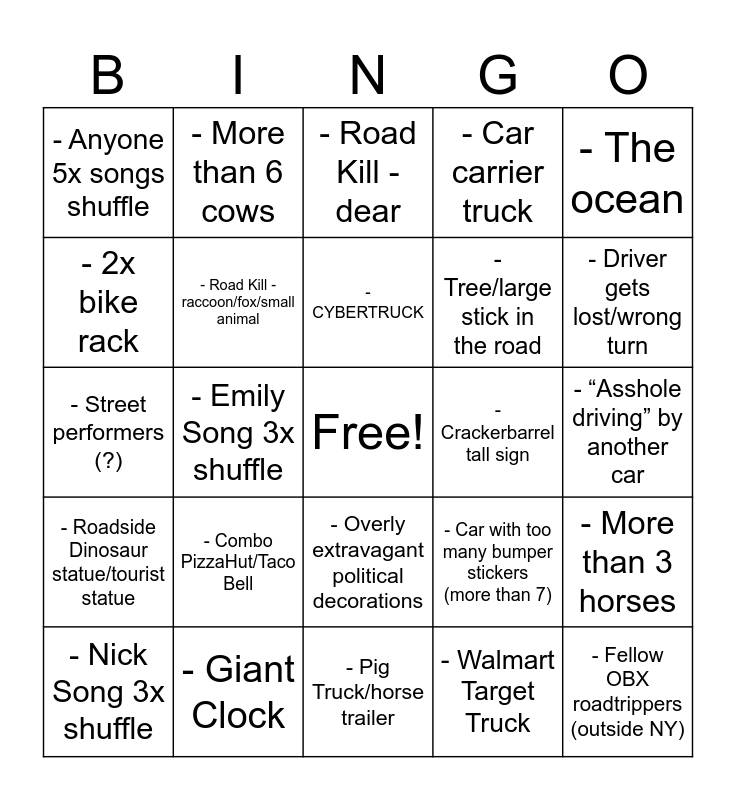 This bingo card has a free space and 29 words: - Nick Song 3x shuffle, - Luke Song 3x shuffle, - Emily Song 3x shuffle, - Charlie Song 3x shuffle, - Anyone 5x songs shuffle, - Road Kill - dear, - Road Kill - raccoon/fox/small animal, - Combo PizzaHut/Taco Bell, - Crackerbarrel tall sign, - Giant Clock, - “Asshole driving” by another car, - Fellow OBX roadtrippers (outside NY), - Pig Truck/horse trailer, - Walmart Target Truck, - Driver gets lost/wrong turn, - Dog dropping a deuce, - Overly extravagant political decorations, - Roadside Dinosaur statue/tourist statue, - The ocean, - Street performers (?), - Car with too many bumper stickers (more than 7), - Street racers/douchey cars, - Tree/large stick in the road, - 2x bike rack, - Car carrier truck, - More than 6 cows, - More than 3 horses, - CYBERTRUCK and - Three wheel car (car with 2 wheels in front, 1 in back).